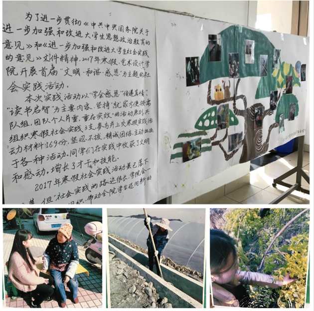 为了进一步贯彻《中共中央国务院关于进一步加强和改进大学生思想政治教育的意见》和《进一步加强和改进大学生社会实践的意见》文件精神,根据学校2017年“文明过寒假、和谐迎新年”寒假社会实践活动的统一安排,今年,艺术设计学院开展首届“文明•和谐•感恩”为主题的寒假社会实践活动,以“学会感恩”、“传递真情”、“读书启智”为主要内容,进一步增强大学生文明意识、培养文明行为、养成文明习惯。