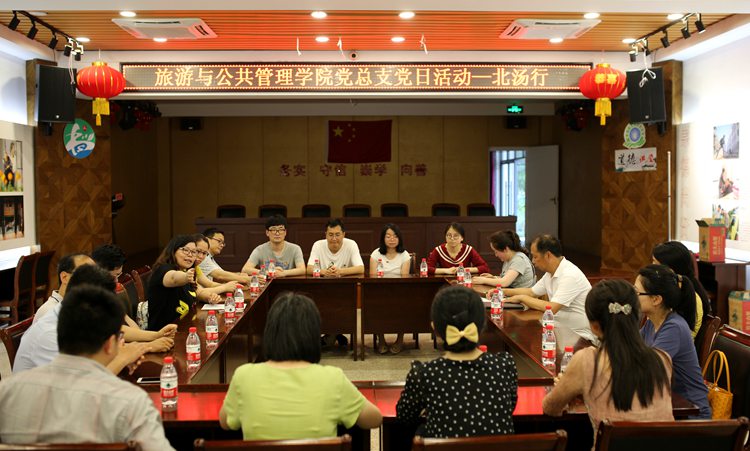 学院党员志愿服务团队对北汤村旅游资源进行了现场考察,深入诊断了北汤村现有产业资源、园区规模、项目特色。在与北汤村党支部负责人进行的座谈会上,旅游与公共管理学院党总支书记步雅芸表示,开展“志愿服务进北汤”活动一是要向北汤村学习艰苦奋斗、创造幸福生活的经验,二是要将旅游管理专业建设与北汤村的旅游实践经验相结合,与北汤村进行深入交流学习,让专业教师结好对,一边学习一边做好服务新农村建设的工作,发挥好党员的先进性、服务性和公益性作用。北汤村党支部书记汪海浪介绍了北汤村党支部党风素质提升过程和北汤村改造历史,以及当前北汤村文化建设、产业特色和旅游园区的整体情况,并表示北汤村目前有向4A级景区冲击的愿景和目标,希望之后可以与旅游与公共管理学院在旅游规划、活动策划、各类培训等方面进行合作。