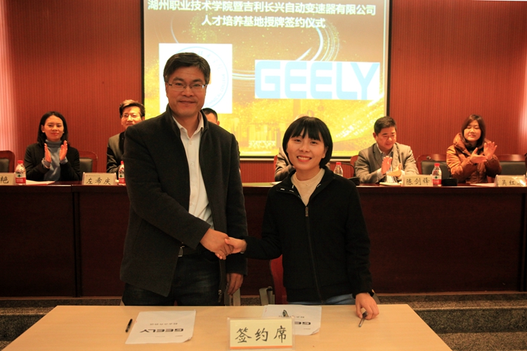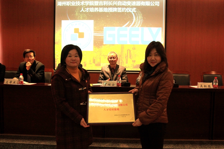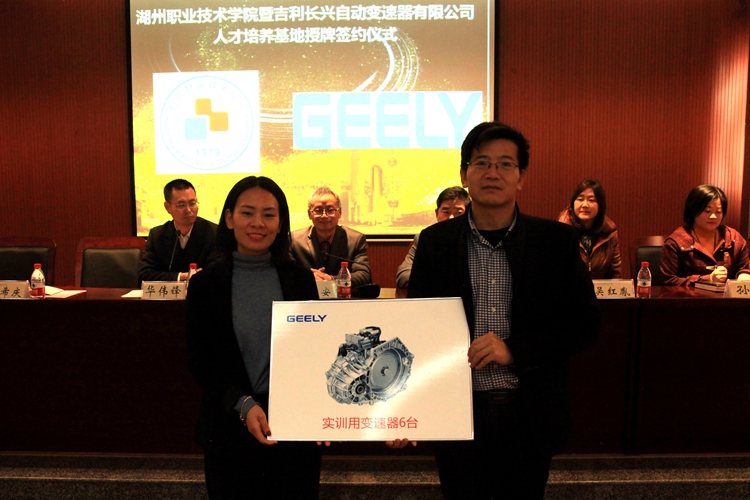 会上,机电与汽车工程学院班子成员与吉利集团代表举行了人才培训基地签约授牌和吉利变速器捐赠仪式。