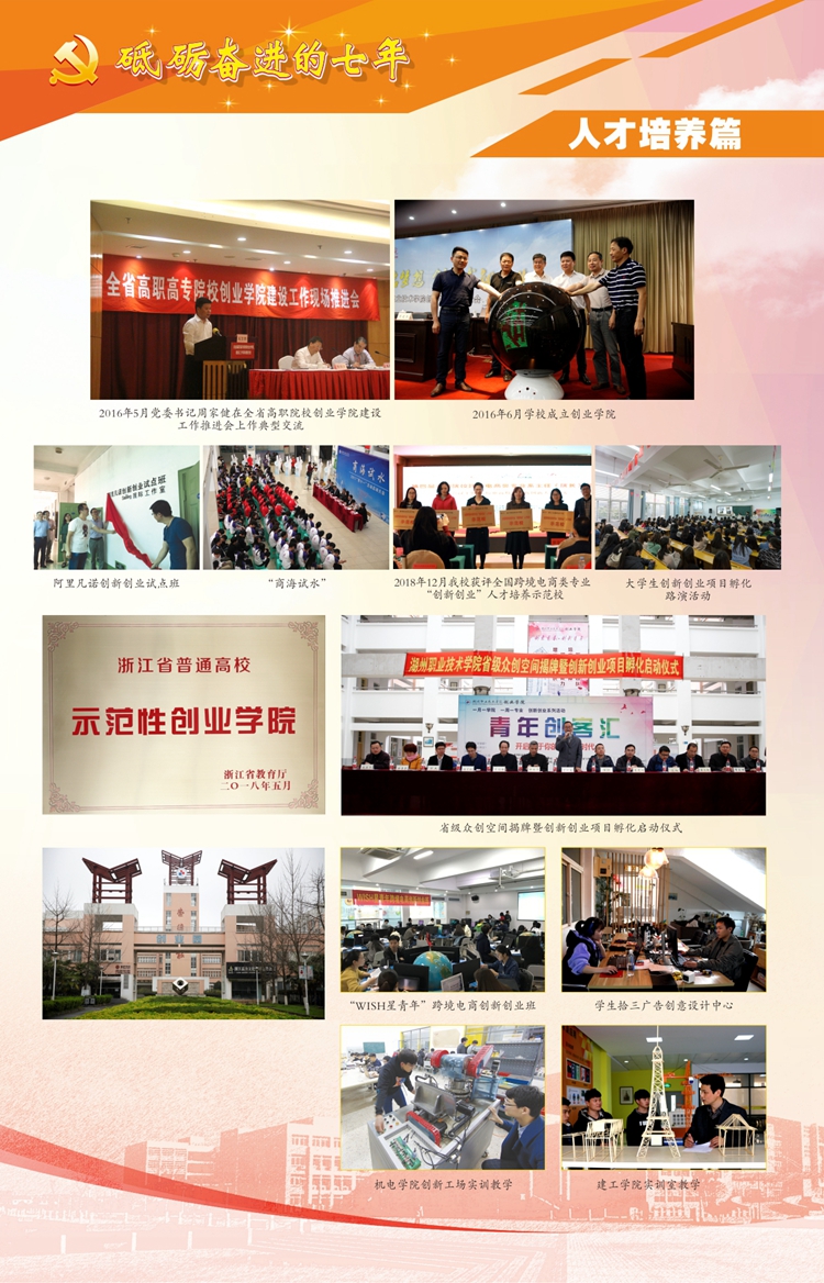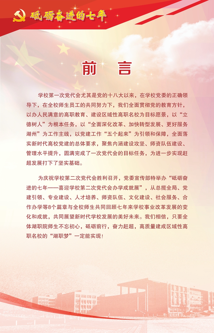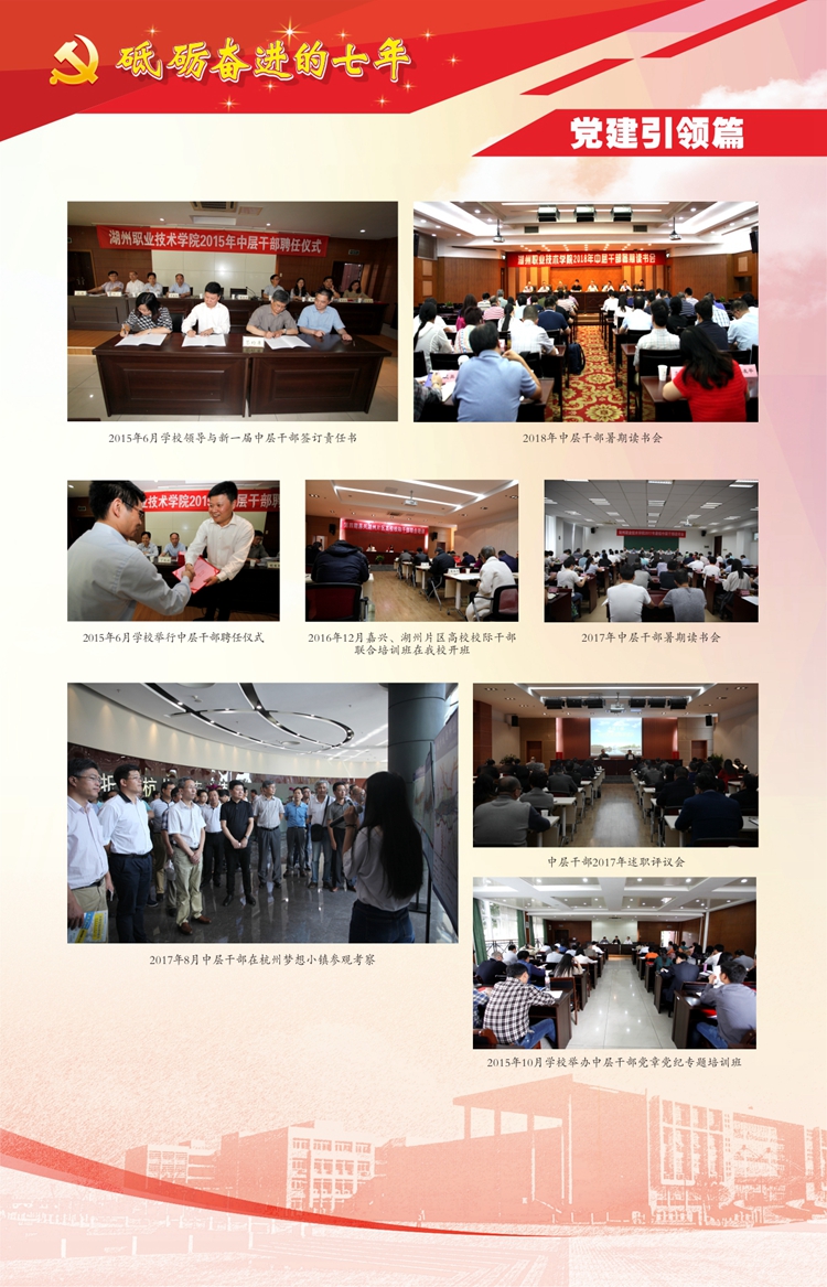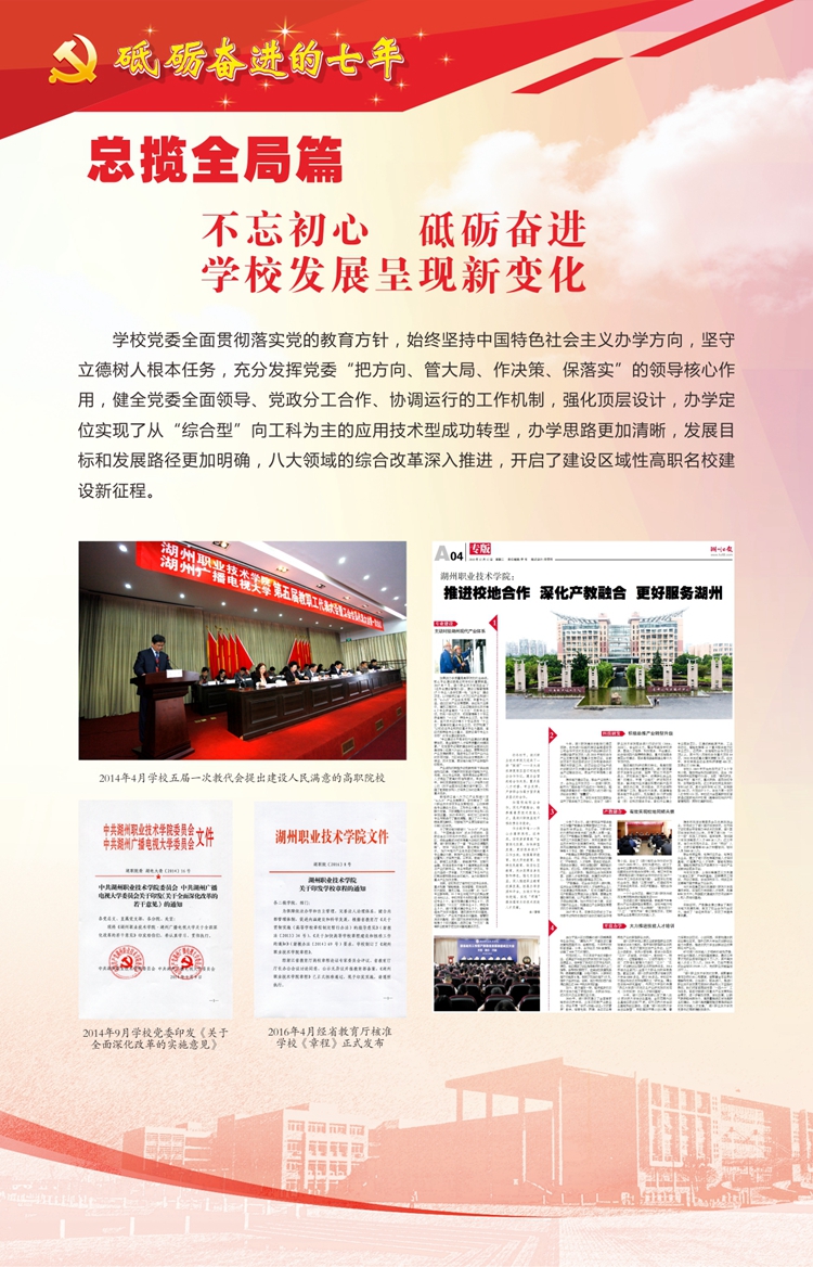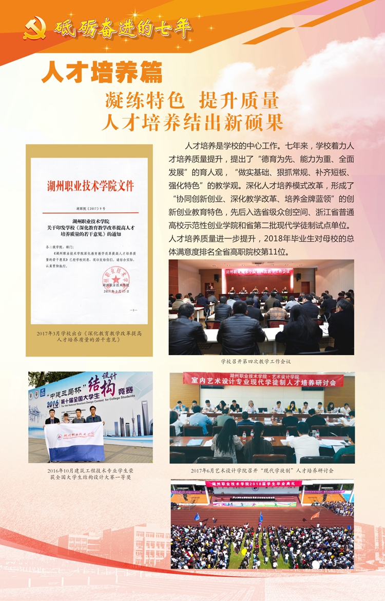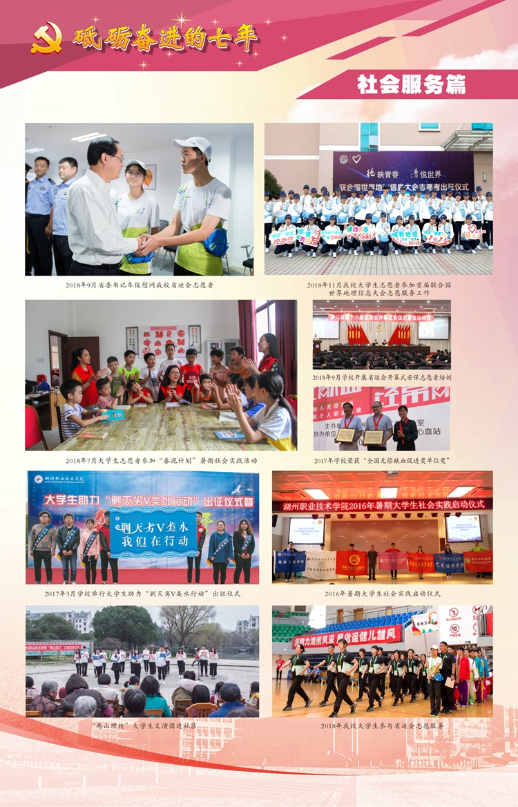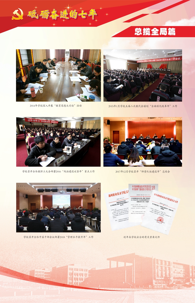 编者按:为庆祝学校第二次党代会胜利召开,党委宣传部特举办“砥砺奋进的七年——喜迎学校第二次党代会办学成就展”,从总览全局、党建引领、专业建设、人才培养、师资队伍、文化建设、社会服务、合作办学等8个篇章与全校师生共同回顾七年来学校事业改革发展的变化和成就,共同展望新时代学校发展的美好未来。我们相信,只要全体湖职院师生不忘初心,砥砺前行,奋力赶超,高质量建设区域性高职名校的“湖职梦”一定能实现!总览全局篇 党建引领篇 专业建设篇、 人才培养篇 师资队伍篇 文化建设篇 社会服务篇 合作办学篇 第一页 <<上一页 下一页>> 尾页 页码 1/10