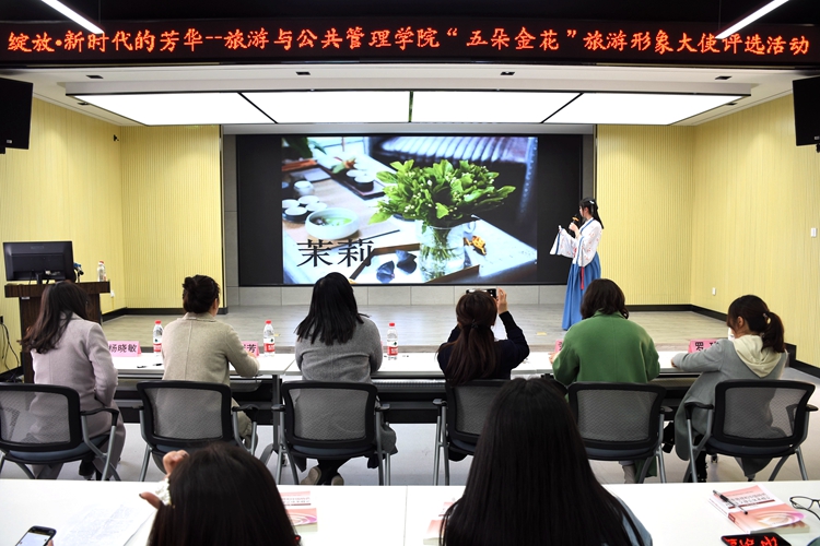 在旅游与公共管理学院实训室,“绽放•新时代的芳华”——五朵金花旅游形象大使评选活动吸引了学院数百名师生踊跃参与。女生们阐述对茉莉、香桂、百合、玉兰、向日葵等五朵金花形象气质的理解,挖掘花朵所蕴含的精神实质,找出“花我相促”的契合点,潜移默化地达到以文化人、文化育人的目标。