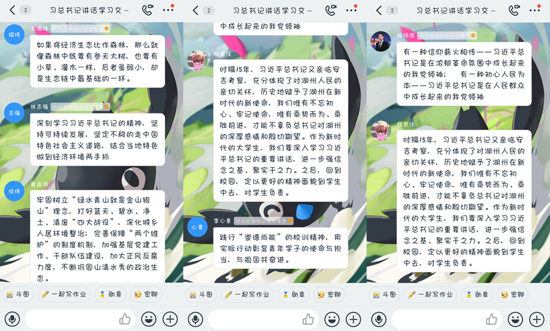 学习会要求,全体学生干部要迅速掀起学习热潮,各级团组织和广大团员青年通过组织开展主题团日等方式进行学习;要聚焦学校“双高建设攻坚”和“22项重点工作”,按照“两手抓、两战赢”的要求做好开学后的志愿者保障工作;要围绕实践育人,特别是两山理念和生态文明教育,着力用好浙江三个地、湖州两个地的资源;要打响“亲青”品牌,发挥各级团组织在推进学校中心工作、开展团委重点工作的生力军作用。会上,习近平总书记在浙江考察时的重要讲话在学校青年中引发热烈反响,他们纷纷写下发自内心的感想。
