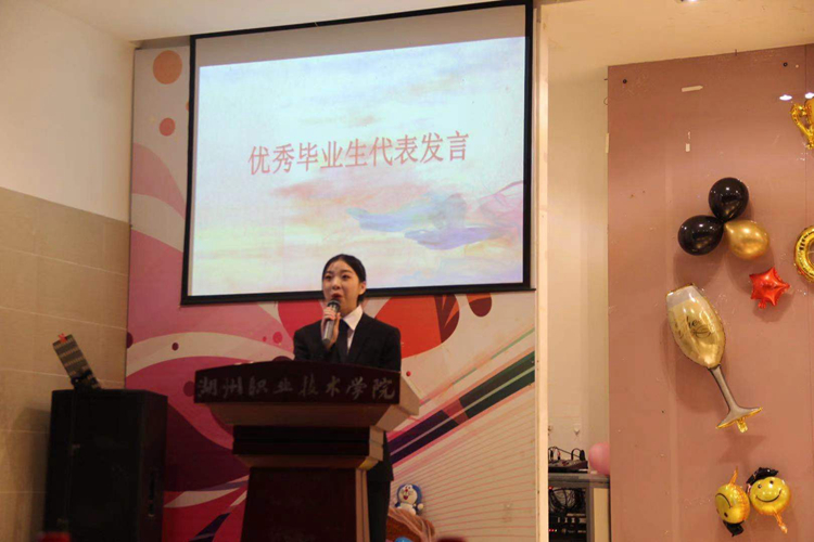 优秀毕业生代表郑佳蕾代表全体毕业生发言,三年里大家在湖职院找到了人生的方向和意义,步入社会后继续不断学习、积累、创新,将中国的传统文化发扬出去,做到实力与情怀并重,谦卑与傲骨并存。