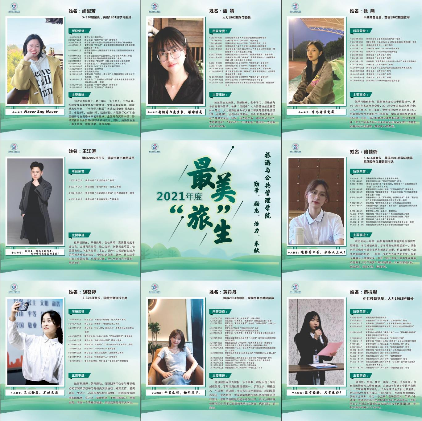 评学贯通宣传美。坚持把评选过程与学习宣传过程贯通融合,线上通过“湖职旅途”微信公众号展示候选人主要事迹并进行网络投票,线下通过主题班会学习讨论,扩大覆盖面、提高影响力。对于最终确定的8名2021年度最美“旅”生,通过宣传橱窗集中展示,迅速在全院范围掀起学习赶超热潮。