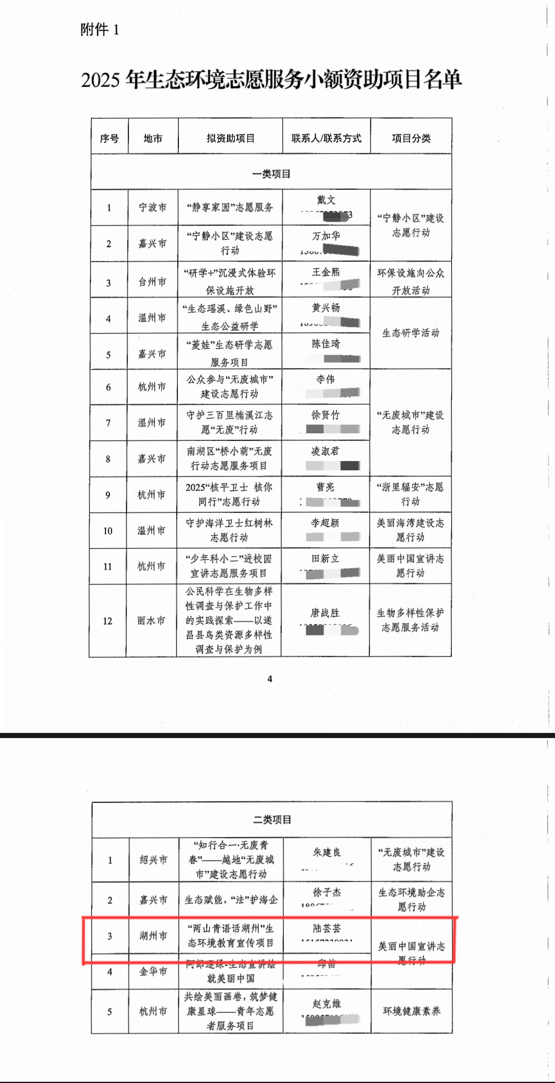 浙江省2025年生态环境志愿服务小额资助项目名单发布,确定立项17个项目,团委青年志愿者协会申报的《“两山青语话湖州”生态环境教育宣传项目》成功入选二类项目,是湖州市唯一入选的项目。